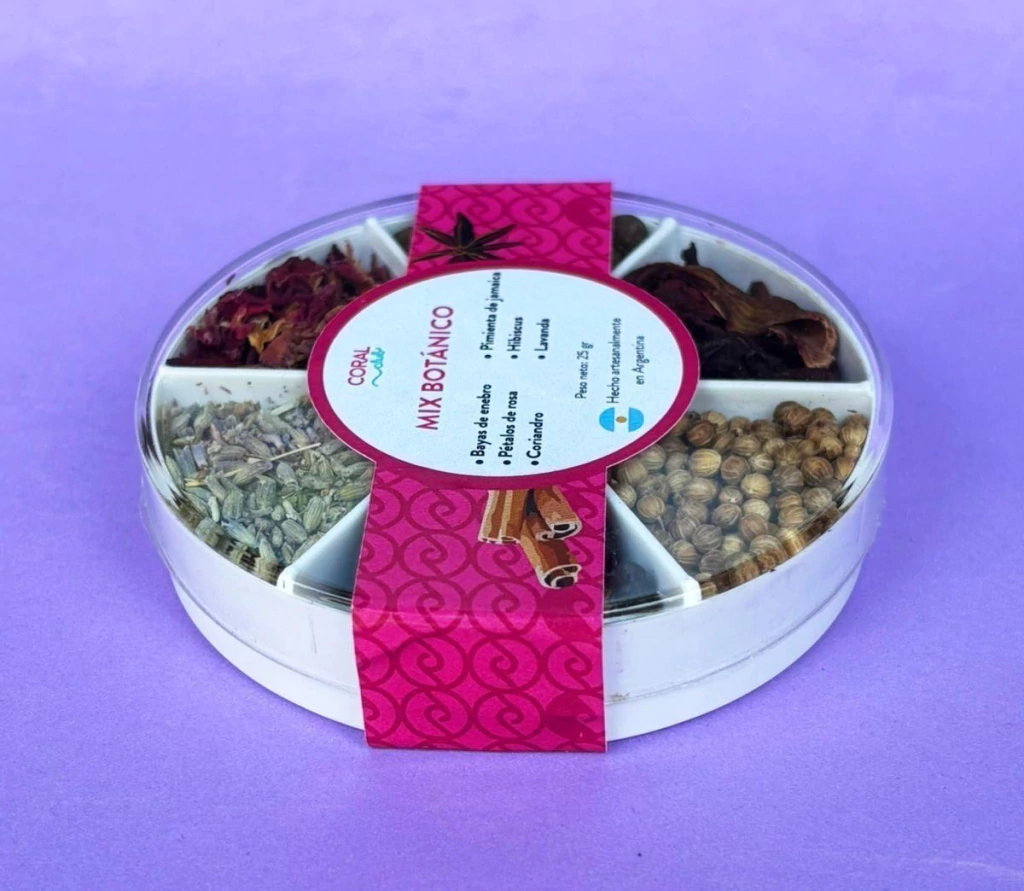 Mix Botanico con 6 especias: Incluye Flores de Hibiscus, Bayas de enebro, Lavanda, Pimienta de Jamaica, Coriandro, Petalos de rosa.